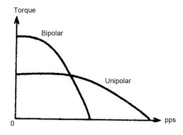 Rysunek 4 przedstawia krzywe charakterystyczne jednobiegunowego silnika krokowego i dwubiegunowego silnika krokowego, z których oba przyjmują ten sam tryb stałego prądu. Ogólnie rzecz biorąc, aplikacje z niskimi prędkościami i dużymi momentami obrotowymi wykorzystują napędy bipolarne, podczas gdy aplikacje z dużymi prędkościami używają napędów unipolarnych.