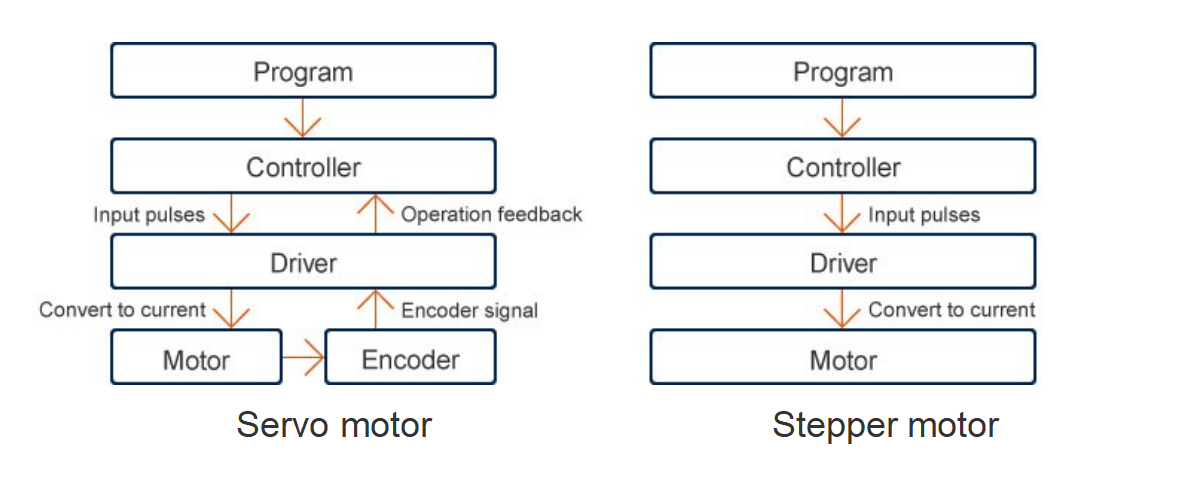 Silniki serwo są wyposażone w enkoder (czujnik ruchu obrotowego), który lokalizuje ich pozycję obrotową i zapewnia kontrolę sprzężenia zwrotnego pozycji silnika. W ten sposób zapewniona jest precyzyjna dokładność zatrzymania, a silnik jest w stanie powrócić do swojej pierwotnej pozycji w przypadku odchylenia od pozycji silnika w momencie zatrzymania. Z kolei w przypadku silników krokowych kąt obrotu silnika jest proporcjonalny do liczby impulsów wejściowych. Dlatego też kontroluje on pozycję na podstawie liczby impulsów wejściowych otrzymanych ze sterownika. Chociaż uniknięto konieczności stosowania czujnika położenia, oznacza to również brak środków do wykrywania odchyleń pozycji. Na przykład nieoczekiwane zmiany obciążenia mogą spowodować desynchronizację silnika (co oznacza, że silnik obraca się pod innym kątem niż określony na wejściu).