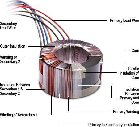 Rdzeń: Rdzeń zwykłego transformatora wykonany jest z laminowanych arkuszy stali krzemowej. Rdzeń transformatora toroidalnego wykonany jest z nawijanej taśmy ze stali krzemowej. Jego rolą jest tworzenie zmiennego strumienia magnetycznego o częstotliwości pod działaniem prądu przemiennego cewki pierwotnej, poprzez zmienny strumień magnetyczny w rdzeniu indukuje potencjał elektryczny w cewce wtórnej, tworząc zasilacz niskiego napięcia. Rdzeń jest głównym elementem służącym do całkowitej konwersji energii elektrycznej, magnetycznej i elektrycznej.